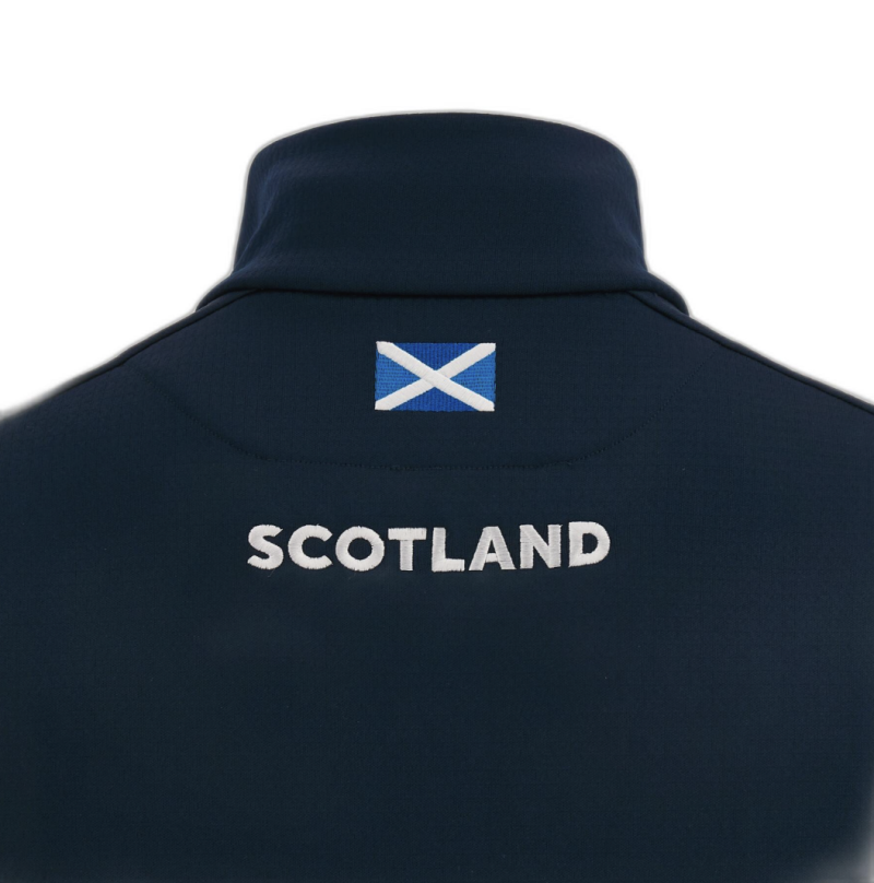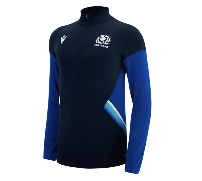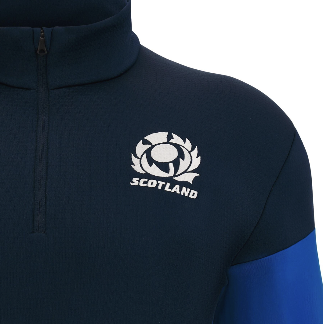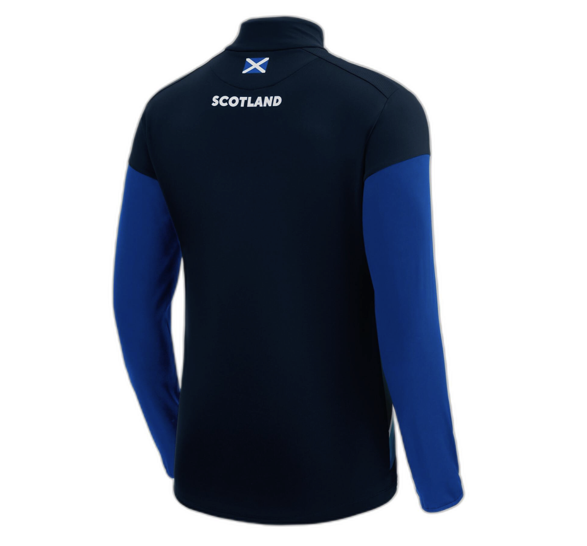 Scotland Rugby Long sleeve navy training top with 1/4 zip, seagreen flashes on the shoulder and triangle pattern over the lower torso.