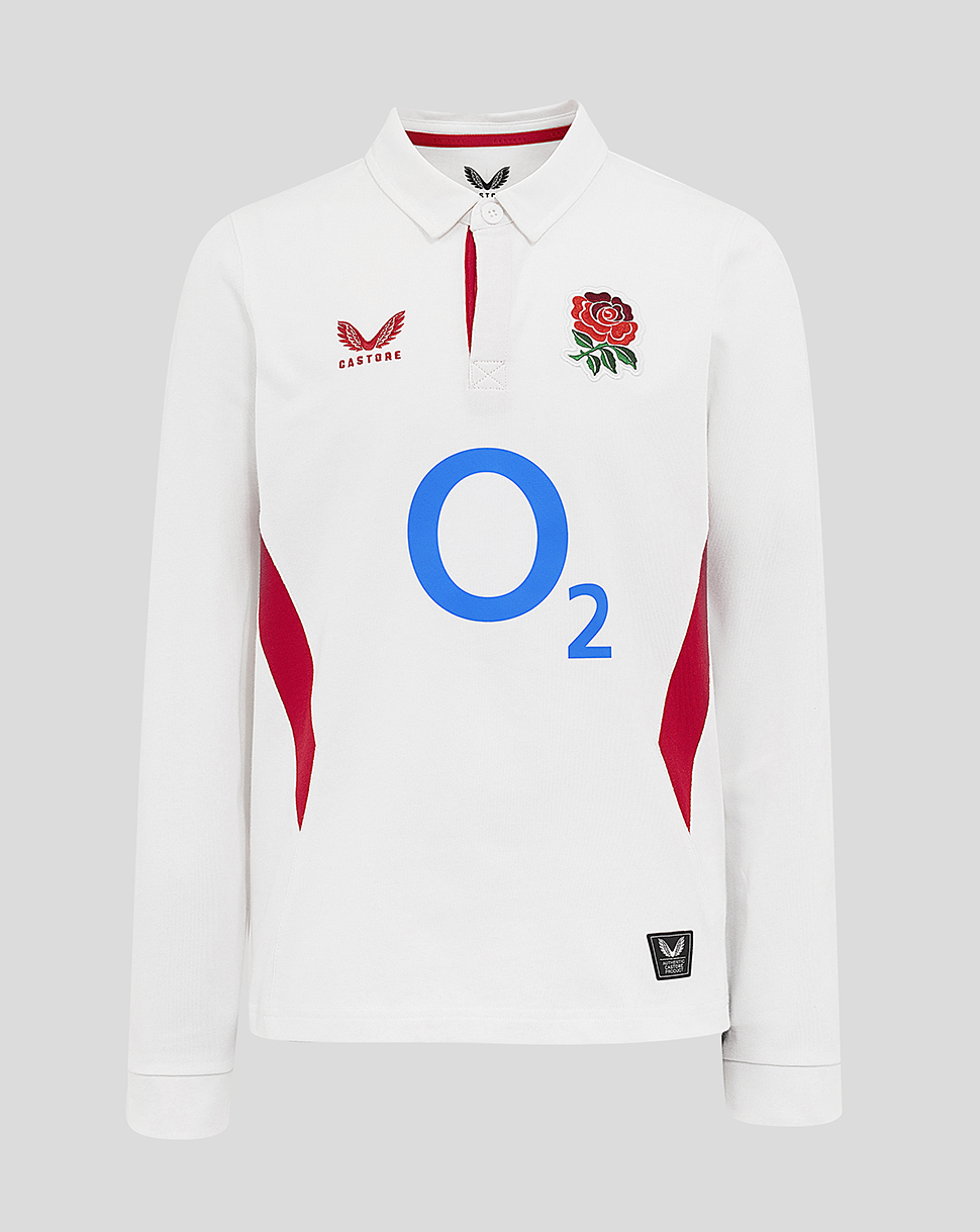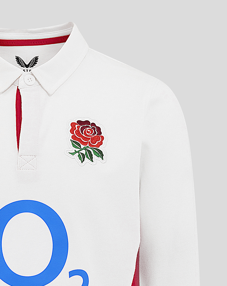 - Bold side and cuff stripes in England Rugby colors