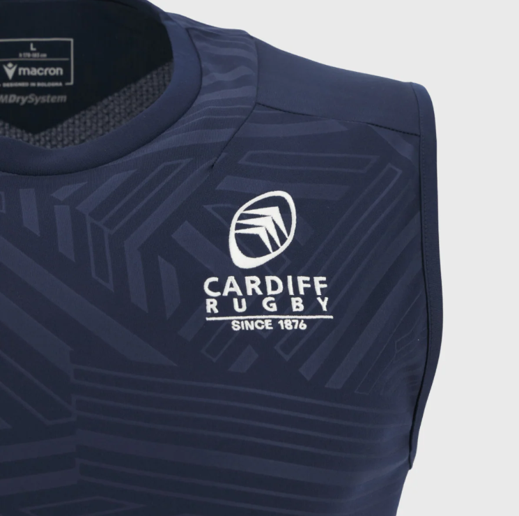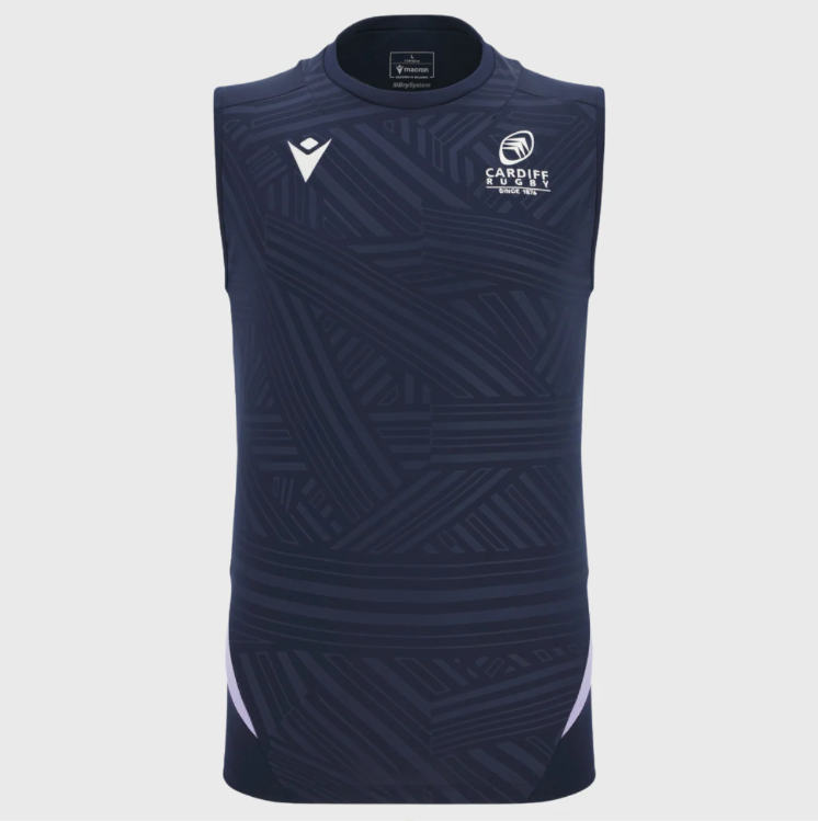 Cardiff Rugby 2025/26 sleeveless training vest. This is a lightweight training vest with printed logos and mesh ventilation panels.