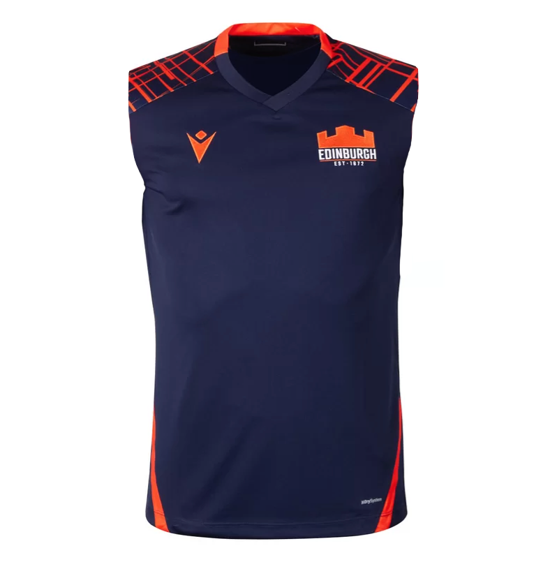 Navy sleeveless training vest with stylised chevron pattern on the flanks, white and orange details on the torso and printed Edinburgh Rugby crest.