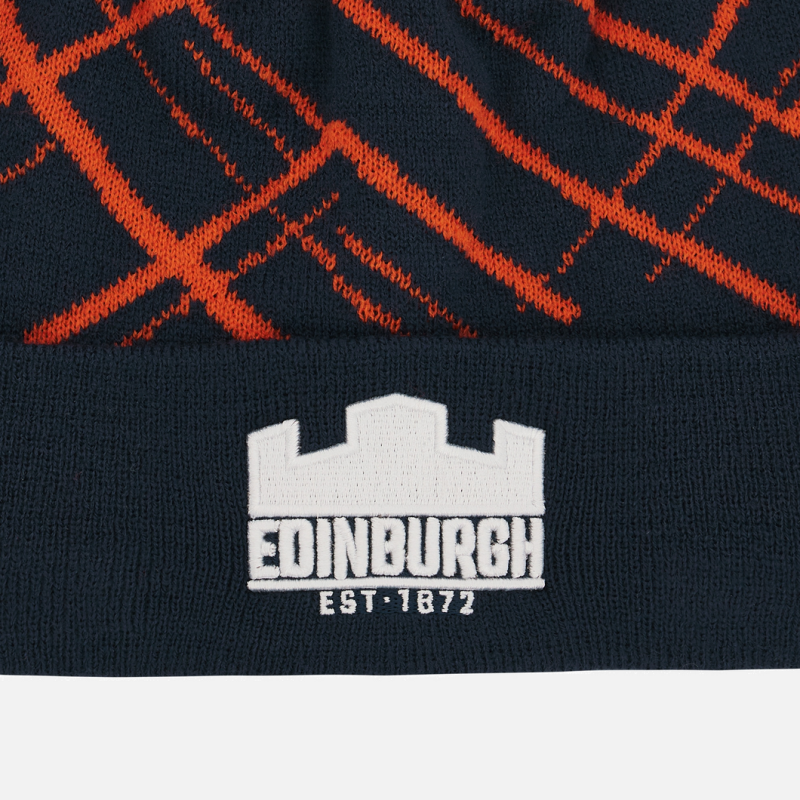 Navy pom pom beanie with orange pattern and embroidered club logo.