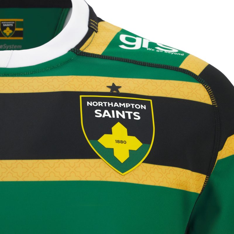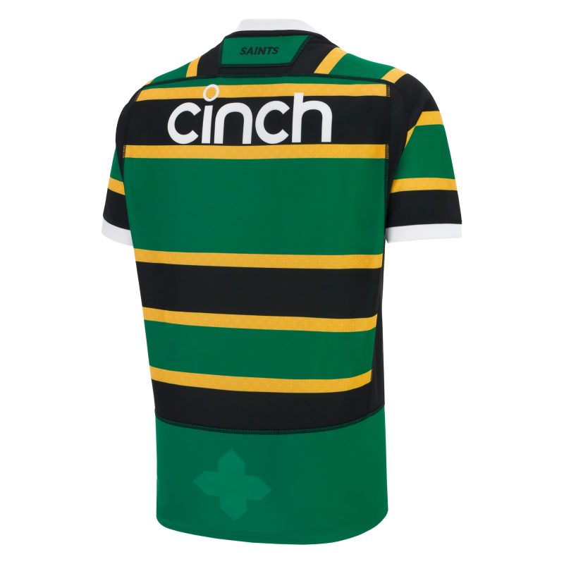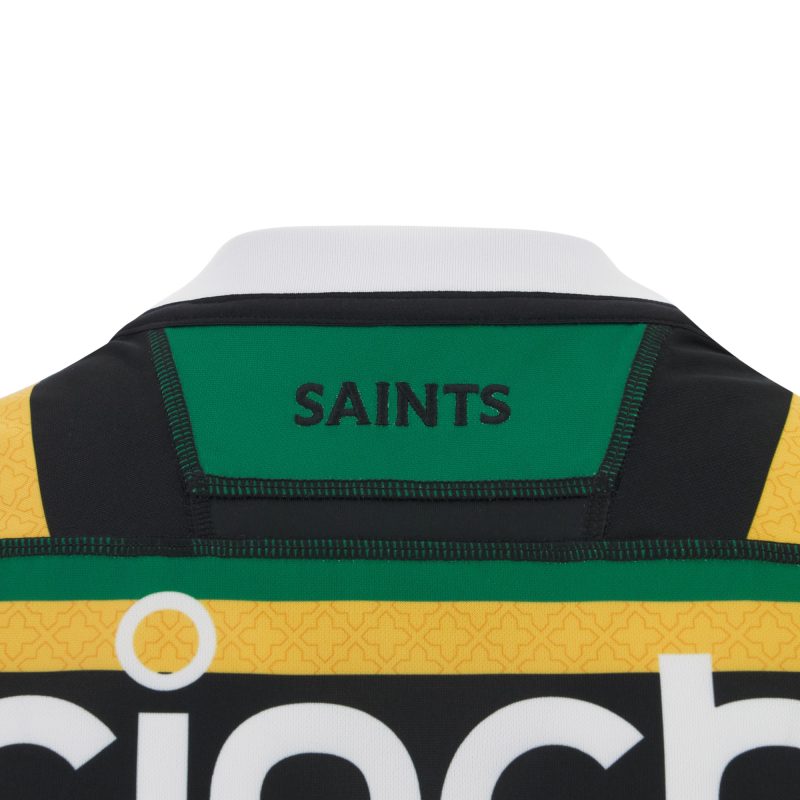 Northampton’s traditional Black, Green and Gold hoops return in 2025/26, with a modern take on the classic design featuring a striking white collar and sleeve cuffs – while the chunky gold bands also encapsulate the Club’s emblem on this season’s shirt.