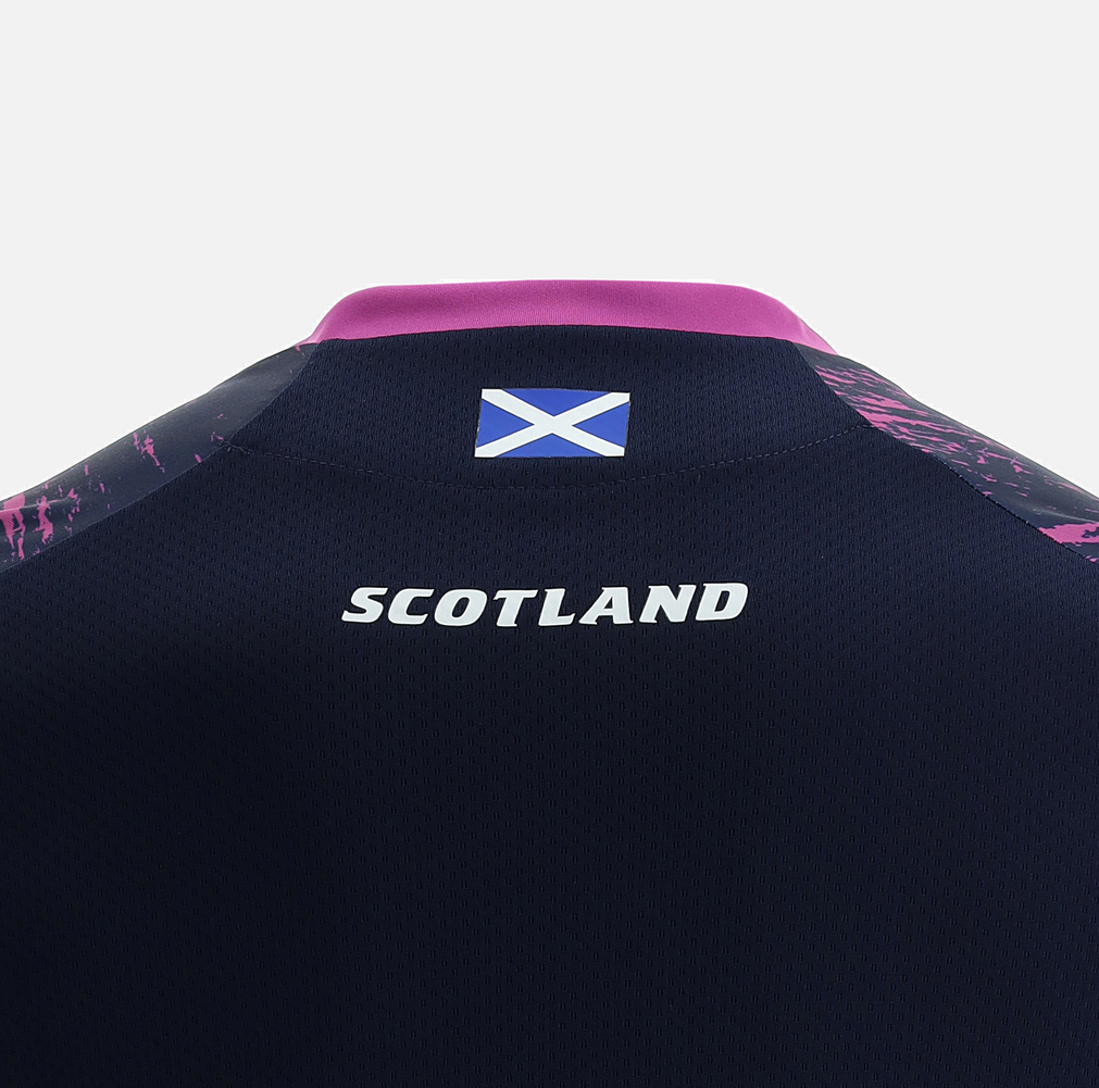 Lightweight navy training tee with purple pattern over the shoulders, electric blue details and printed Scottish Rugby crest.