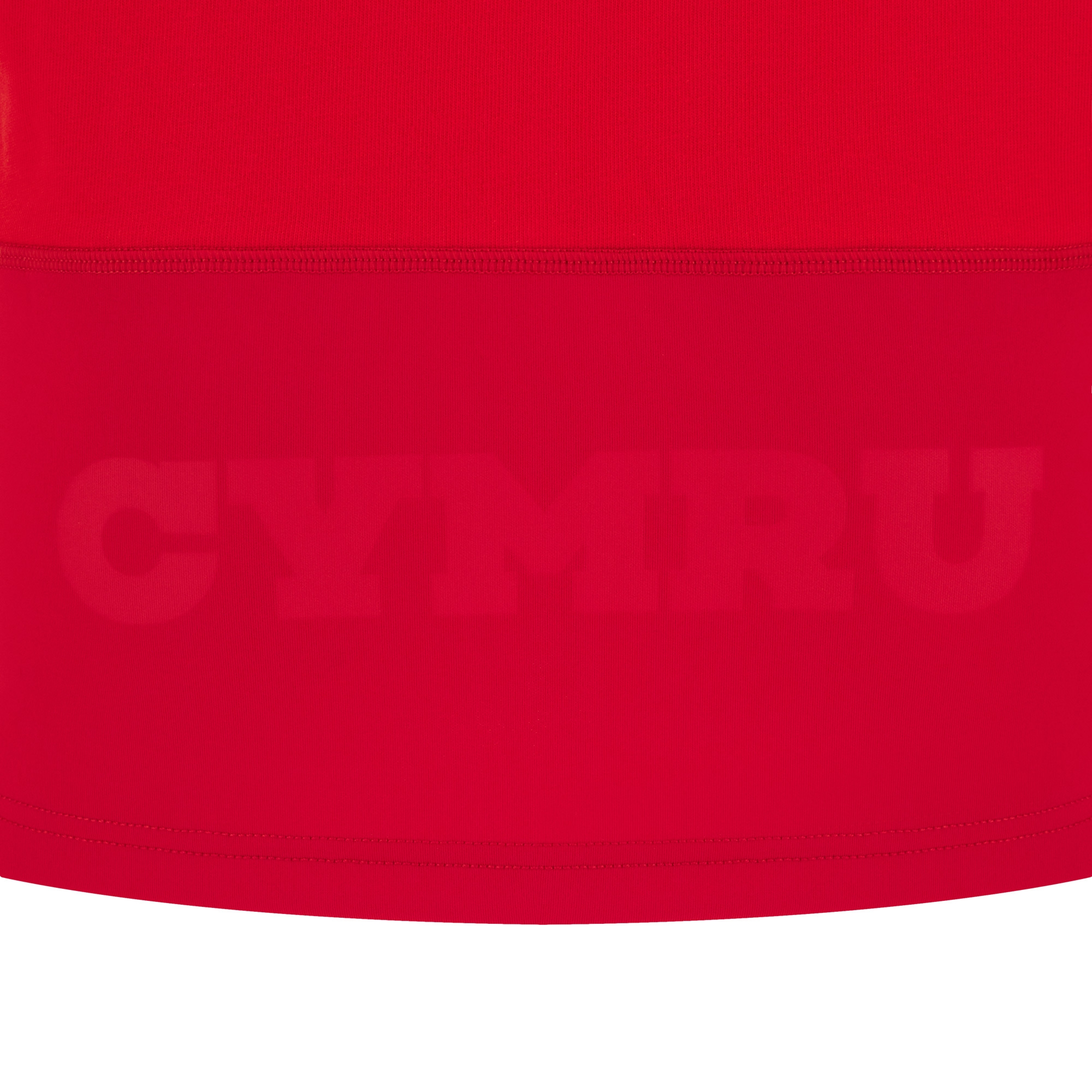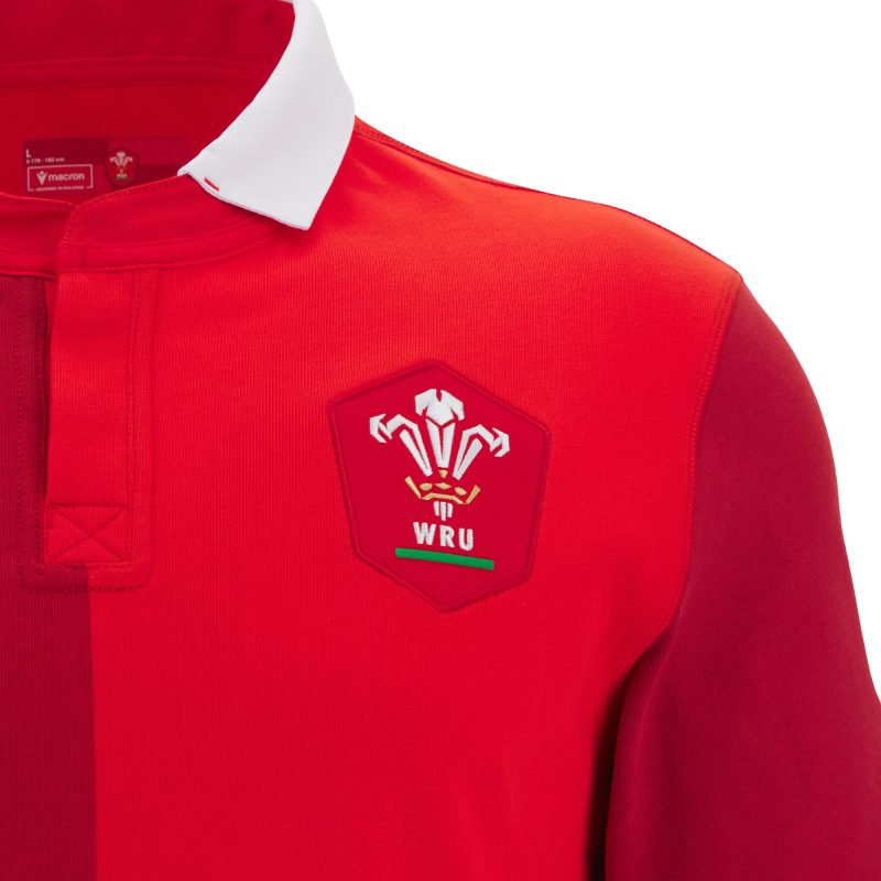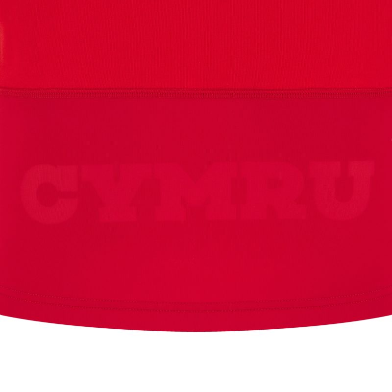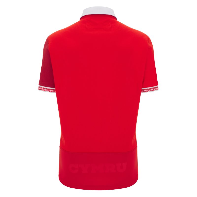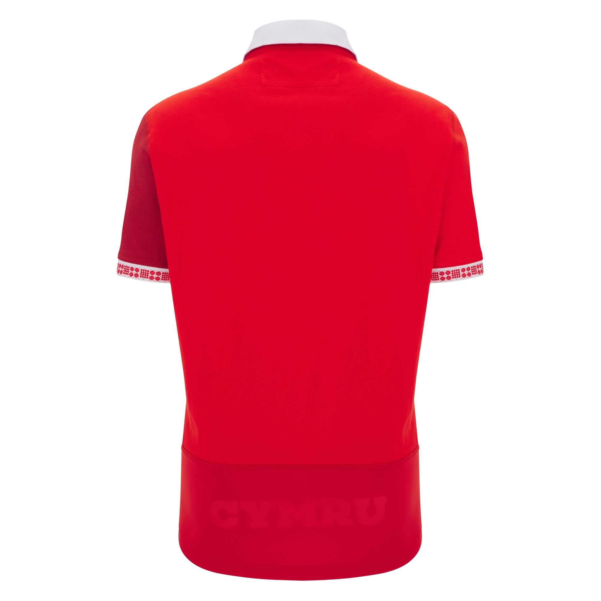 Welsh Rugby 2025/26 home cotton shirt – red relaxed fit, short sleeved shirt with tone on tone quarters, white collar and cuffs, Cymru emboss on the rear and Welsh Rugby crest embroidered over the heart.
